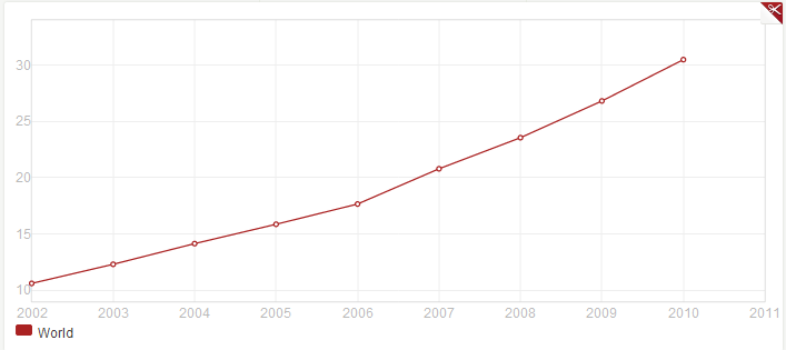 2011年3月份,全球互联网用户突破20亿,互联网已经把世界近三分之一的人联系起来。但全球仍有 50亿的人无法使用互联网,也就是说,互联网在未来还有很大的发展。