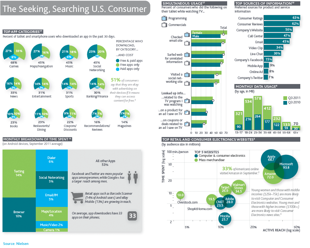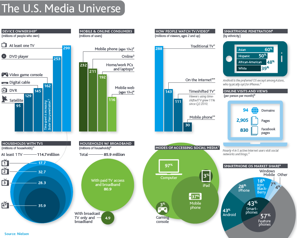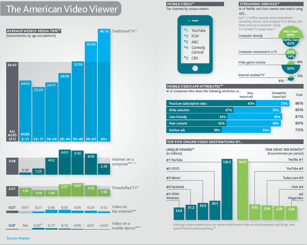 尼尔森:2011年美国及全球用户电视,网络和手机媒体使用报告 尼尔森发布了2011年全球和北美的媒体使用情况,包括电视,网络和智能手机等的使用分析: 其中关键数据有: 1、1/3的美国电视家庭拥有4台及以上的电视机;2、有2.9亿美国人拥有至少1台电视机,电视是最流行的媒介设备;3、2.88亿的人仍然通过电视收看视频内容,超过通过网络收看的1.43亿网络视频用户;4、广告主要追求全面的品牌覆盖,还得依靠电视 美国用户的媒体使用情况 美国用户视频收视行为 美国用户的搜索查找行为 全球用户终端使用行为 更多阅读:Nielsen:女性体育的兴起Totem:2022年中国营销与媒体报告eMarketer:媒体出版业的移动救赎热点图告诉你用户的注意力都在哪??PPT:用户体验之用户研究方法Econsultancy:存在了90年的提高转化率的智慧Infographic: 在不同的媒体创建炫目内容之善用22种内容营销技巧ComScore:2013年美国假期购物季桌面计算机用户网络购物支出同比增长10%企鹅智酷:2016年微信影响力报告AdMaster:新闻资讯App媒体价值综合指数排名eMarketer:在碎片化中重新思考大众媒介eMarketer:广告主须重视游戏用户的跨平台营销Digital TV Research:未来五年亚太地区付费电视用户将增加6800万为什么用户常常不会做最合理的选择?百度MUX:在线问卷调研的局限与对策