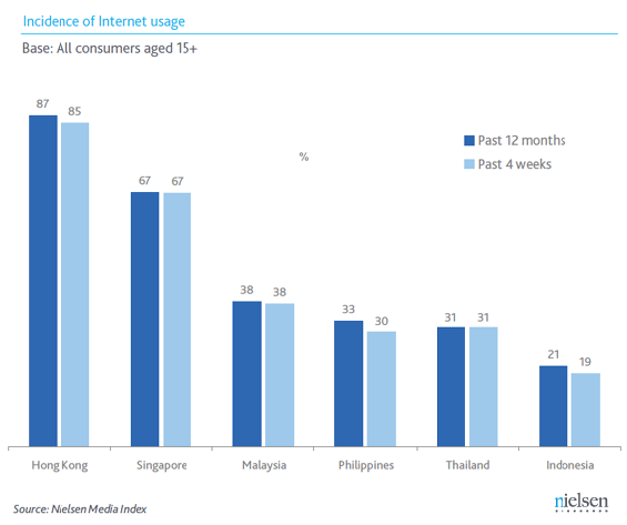 互联接入在香港已经是无处不在,过去1年中,87%的用户使用过互联网,超过新加坡、马来西亚、菲律宾、泰国和印度尼西亚等国。互联网使用率在12-44岁的人群中使用尤其高。