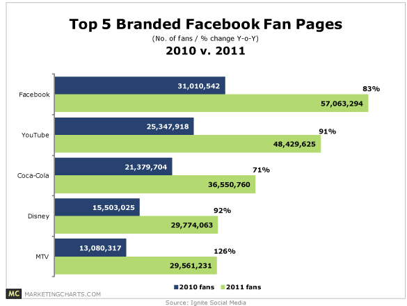 根据2012年1月,Ignite Social Media的分析,MTV的Facebook粉丝在2011年12月29号已经达到2960万,比2010年12月28号增长126%。Facebook在2011年以5700万粉丝仍然高居首位,比2010年增长83%。Youtube和coca-cola分别有4840万和3650万粉丝,分别为第二、三位,分别增长91%和71%。