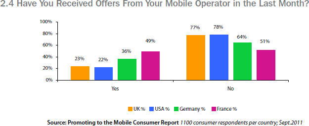 有趣的是,36%的德国人和4%的法国人在过去一个月中接收过来自移动运营商的促销,而英国和美国用户分别只有23%和22%。