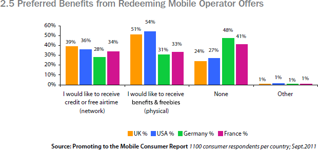 美国人愿意接受实体的好处和免费赠品的好处比接受来自虚拟&积分提供的的特惠要高50%(54%比36%)。英国为51%比39%。德国和法国,用户在接收不同类型的促销信息上差异不大,但他们对运营商的抵制都比较明显,48%的德国人和41%的法国人表示不愿意接受任何促销信息。而美国和英国,大约有1/4的用户不愿意接收。