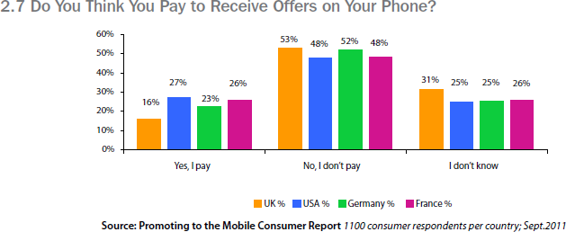 根据DMA Uk的分析,对促销信息成本的顾虑是用户拒绝接受促销营销信息的根源。事实上,27%的美国用户认为他们接收到的促销信息会扣钱他们的话费,而25%的用户表示不知情,在4个国家中,只有一半的用户知道,他们不会为收到信息而付费。