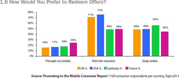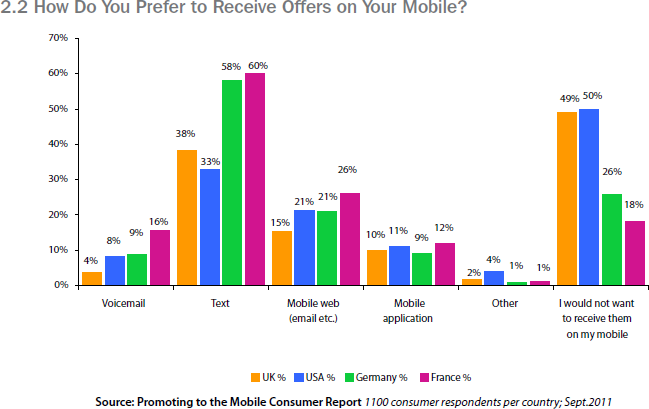 根据UK DMA2012年1月发布的报告显示,1/3的美国消费者选择通过短信接收移动促销信息,超过了移动网页(含括电子邮件,21%),移动应用(11%)和语音邮件(8%).这些差异在英国用户中比较小,而在德国和法国中差异比较大。比如,这些国家中有3/5的用户选择通过短信接收,而只有1/10选择移动app。