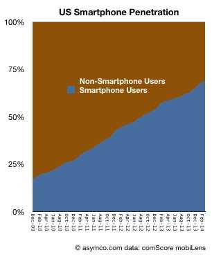 唯一的结论是,尽管当前只是68.8%的渗透率,美国智能手机用户离“饱和”还很远,而美国是“发达国家”的领袖,所以,有一点要说的是这个拥有众多人口的市场,随时都有可能达到饱和。