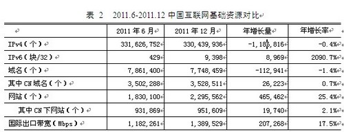 在IP地址方面,截至2011年12月底,我国IPv4地址数量为3.30亿,较2010年底增长19.0%。拥有IPv6地址9398块/32,相比2010年同期出现大幅增长。