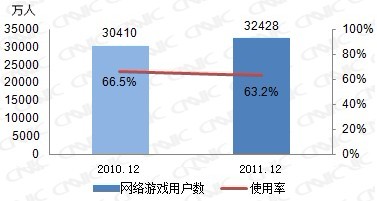 中国互联网络信息中心(CNNIC)16日发布《第29次中国互联网络发展状况统计报告》。报告显示,截至2011年12月底,中国网络游戏用户规模达到3.24亿,较去年同期的3.04亿增长6.6%,网民使用比例为63.2%。