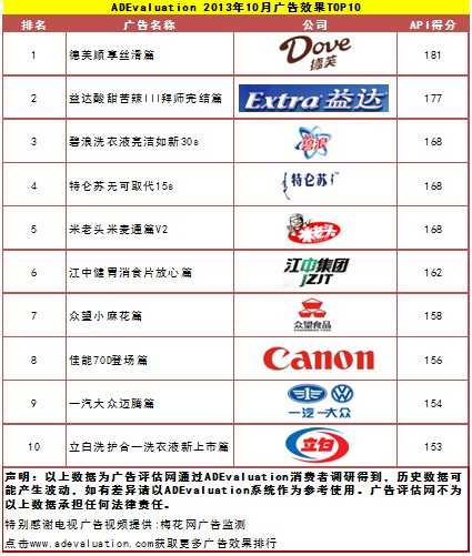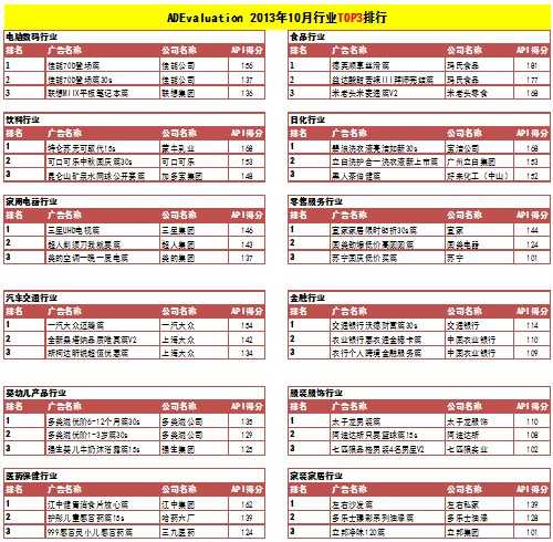 根据广告评估网ADEvaluation最新数据显示,2013年10月广告创意数量总计413条,较上月广告数量明显增多了176条,参与广告评审消费者达8.3万人次。从广告分类来看,日化类广告以83条的总量,成为本月广告最多的品类。紧接着的是食品类和饮料类,分别是72条和67条。总体来看,本月各个品类的广告数量较上月都有所增多,日化、食品、饮料类稳居前三位。这也预示了广告进入投放旺季。从公司类型来看,大陆地区广告以59%的创意比例高于其他地区,占242条,其次是欧美地区,占113条,日韩和港台地区分别占30条和26条。广告创意效果(API)情况,先从广告分类来看,本月各品类API表现平平,电脑数码类依旧是本月冠军,相较上月API均值表现基本持平。婴幼儿产品类的上升速度最快达到104.3分,位居本月第二,另外日化类(98.6),医药保健品类(78.2),家用电器类(95.8)都有小幅度上升,其他食品类(94.4),饮料(95.1),汽车交通(90.7),金融(91.5),家装家居类(88.9),服装服饰类(95.4),零售服务业类(96.6)的表现并不明显。