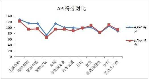 从广告总体市场表现(API)得分方面看,本月前三位广告的API均值均低于上个月的前三位的API均值,本月广告质量有所下滑。其中,电脑数码类广告以121.7的均分依旧排名第一,但第二、三名均相对于上个月产生了很大的变化,4月位于第五位的饮料类广告以108.8的均值上升到本月的第二位,同样,上月的第六位的食品类广告以107.5的均值跻身第三位,而上月第二名的服装服饰类广告则以94.7的均值掉到了本月的第六位,家用电器类以95.7的均值由原来的第三位下降到本月的第五位。另外,日化类广告上升趋势较大,从原来的第九位上升至本月的第四位,均值为98.4,金融类广告本月API得分排名下降幅度比较大,从上月的第四位下降到本月的第七位,均值为94.3。
