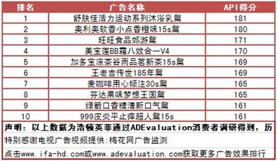 “舒肤佳活力运动系列沐浴乳篇”广告以API得分181位列5月份广告效果排行榜榜首,“奥利奥软香小点香橙味15s篇”以180分名列第二。本月TOP10,饮料4条,食品3条、日化2条和医药保健品1条。从广告属性来看,依旧是产品类广告8条占据绝大部分比重。