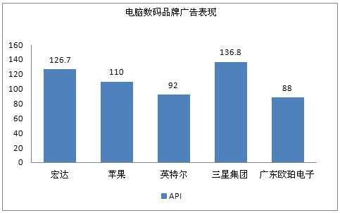5月份的电脑数码类广告数量和上个月的10条持平,API方面虽然依旧是冠军行业,但均值有所下降,从上月的127.5下降到本月的121.7,降低了4.5%,同时也跌出了本月所有广告API得分的TOP10,所以,本月的电脑数码类广告API表现并不理想。另外,10则广告中,有9则都是移动电话广告,只有一则电脑广告,数码产品则没有。9条移动电话广告中只有一条是大陆品牌广告且API得分仅有88分,和其他区域品牌的API均分差距悬殊,广告质量亟待提高。从广告品牌来看,其中有4则三星广告,3则宏达广告,本月此品类广告基本上是三星和宏达之间的博弈,从本月的数量和API得分来看,三星的广告表现都优于宏达。