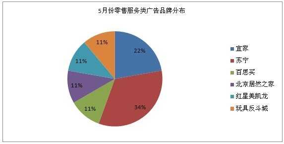 5月份的零售服务业广告数量为9条,经过了4月份仅2条广告的低谷,本月数量开始有所回升。以前比较活跃的苏宁、宜家分别贡献了3条、2条广告,前三位的API得分分别是145、138、121,广告质量都比较高。另外,在9条中有6条是促销类的广告,产品类广告仅有3条。