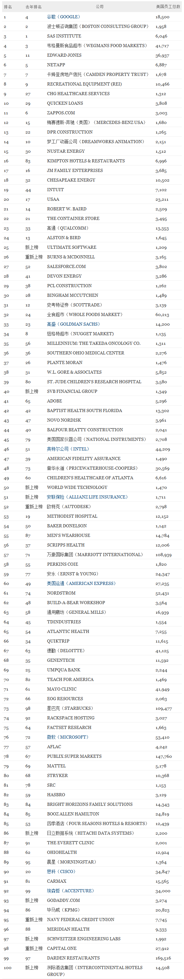为了挑选出100家卓越雇主,《财富》杂志与Great Place to Work 研究所合作,对美国公司雇员进行了最广泛的调查。