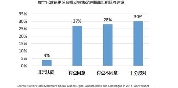 根据Conversant.的一份调查报告,零售商在数字化营销渠道上的投入占总营销预算的38%。此外,有20%的零售商将总营销预算的50%-75%投入数字化营销渠道,甚至有19%的零售商在数字化营销渠道上的投入占到了总营销预算的75%-100%。这份报告的数据源自2013年12月一项对于82位零售业(包括传统型零售商和电子零售商)高级营销主管的调查。