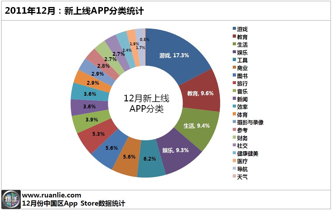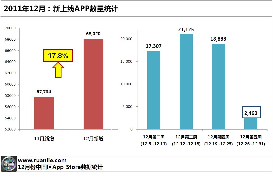 据软猎最新数据监测,2011年12月份中国区App Store共新增应用数68,020款,比11月环比上升了17.8%。至此,截至2011年12月31日的APP在线累计数首次突破了50万款,达到了503,138个。