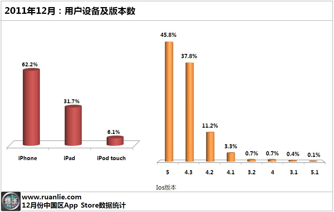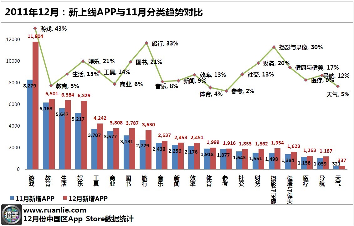 软猎分析,12月中国区App Store应用数量的大幅增长,显示了开发者们对年末市场的信心十足,鉴于2012年1月,中国会迎来为期七天的春节长假,中国的APP开发市场尤其是个人开发者或将迎来短暂的“沉默期”。传统国人对春节期间回家团聚、走亲访友等社交活动的重视,也势必会对APP产品疏于关注,如此,付费应用的开发者或将掀起一轮“限免”高潮,扩容流量,冲击榜单,迎来APP市场短暂的“放养、生息”阶段!