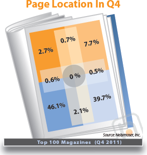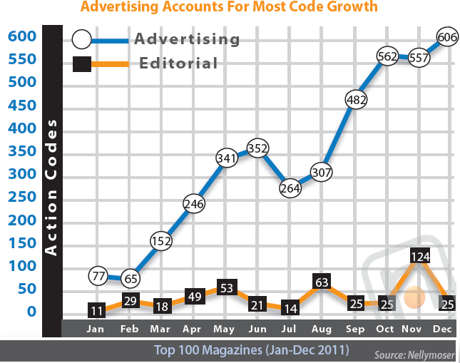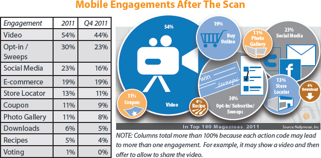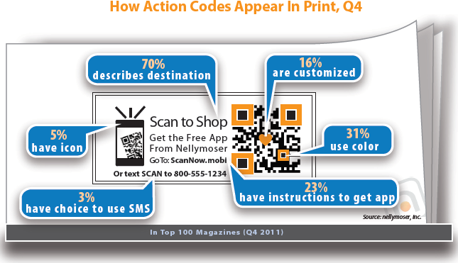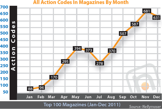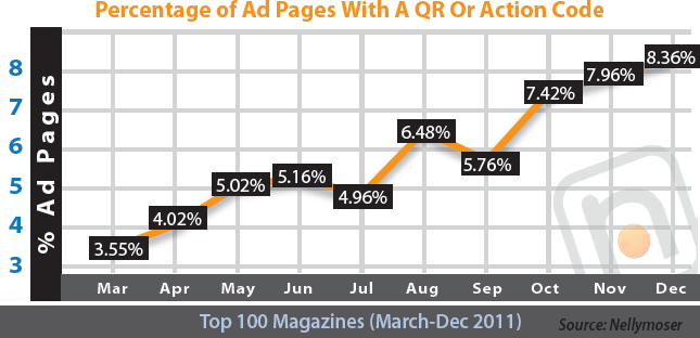 Nellymoser调查了全美前100本流通的杂志研究了QR码的使用情况,为了分析数据,Nellymoser分析了前100杂志的每一个页面,2011年,他们分析了164255页内容,Q4的杂志一共有47788页,而Q3为40300页,其中全部广告页为21790,比Q3的18407上升。