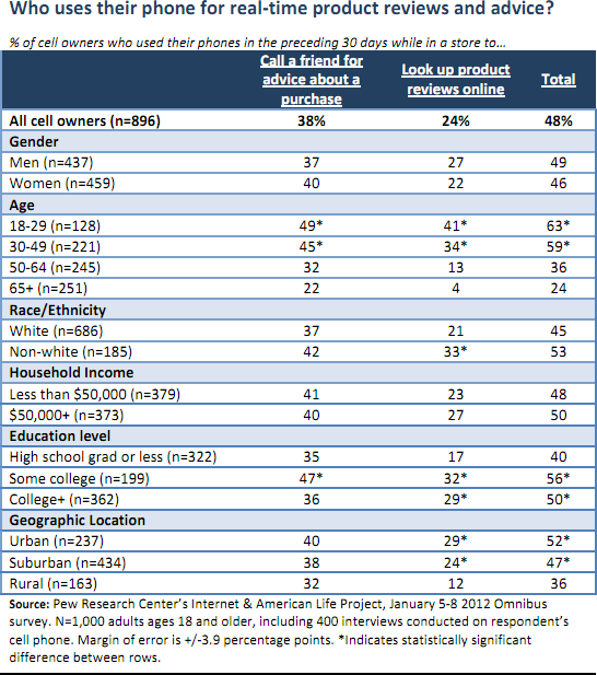 Pew:不断增长的店铺内移动购物 2011年节假日期间,超过一半的成年手机用户在商店时使用他们的手机来辅助购物决策。在圣诞节前后的30天时间内: 38%的用户当他们在商店考虑购买某个商品时,使用手机寻求朋友的购物建议 24%的手机用户在商店时,使用他们的手机来在线寻找产品评论 25%的成人手机用户在商店时,使用他们的手机来寻找价格信息,来看看是不是在别处能买到更好的商品 更多阅读:Pew:35%的人会用手机去访问电视上提到的网站Pew:手机使用的代沟eMarketer:增强实境技术是CPG消费者最有效的工具Pew:地理位置服务为营销者提供了新机会Pew Internet:17%的美国手机用户主要用手机上网eMarketer:手机对用户购物路径的影响eMarketer:智能手机将成加拿大网民新的重要媒体接触点Pew:每天使用Twitter的美国用户在增加Econsultancy:移动优化站点带来高的用户转化率和每订单金额Nielsen:移动广告驱动PC购物Nielsen:美国数字消费报告研究Nielsen:移动终端令消费者在线下线上都更强大eMarketer:英国老年人是精明的数字购物者,但他们并不会进行网购eMarketer:移动设备的火爆并没有影响店内购物CNNIC:网络购物地区学历研究