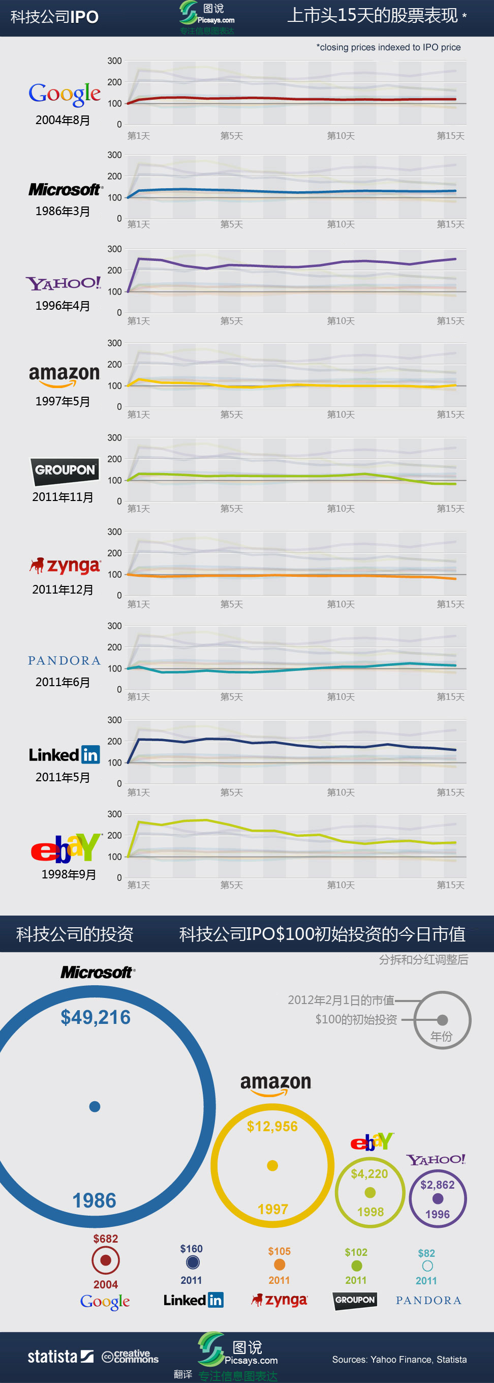 2011年是不折不扣的科技公司IPO年,从Groupon到Pandora再到Zynga和Linked in,而Facebook将IPO之路从2011走到了2012,随着Facebook踏上IPO之路,我们不得不关注一下科技公司的IPO之路到底走得如何了?西雅图数据分析公司Tableau Software在2011年末时研究当年美国股市的24起科技公司IPO后发现,科技公司IPO的整体表现差于其他行业公司。在Tableau Software追踪的24起科技公司IPO中,只有1/3公司周一的收盘价高于IPO价格。