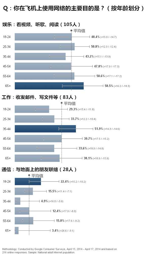 按年龄划分:年轻人主要使用机上Wifi与地面上的朋友联络。也许Gogo应该考虑推出专门的聊天套餐。