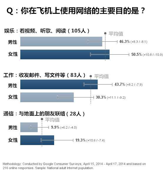按性别划分:男性使用机上Wifi主要是为了工作,而女性更多的是为了娱乐和通信。由于调查规模较小,不同性别间的行为差异还有待进一步研究。