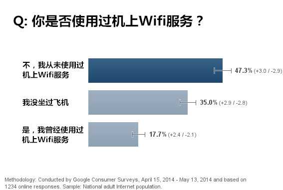 本次研究通过Google Consumer Surveys以调查问卷的形式进行。受访者需要首先回答一个筛选性问题:“你是否使用过机上Wifi服务?”,选择“是”的受访者将继续回答自己使用该服务的目的是什么,如工作、娱乐或通信。