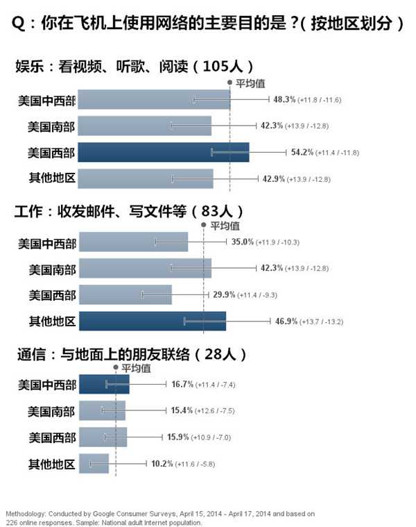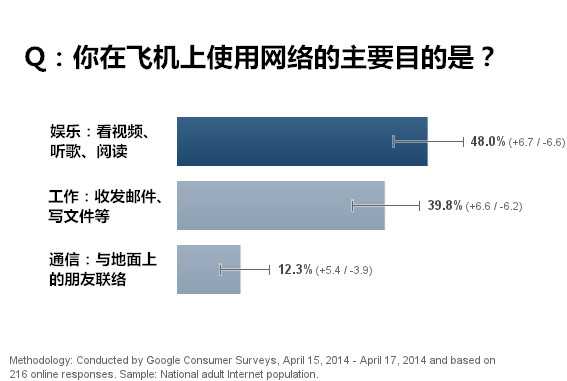 我们得出了一个有趣的结论:美国大多数乘客使用机上Wifi的目的在于娱乐和个人通信,只有很少一部分人表示是为了工作。