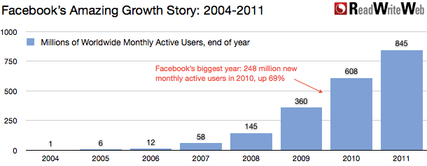 自2004年创建以来,Facebook的用户数量持续增长。从2008年以来,每年增加的用户都数以亿计。从图中可以看出。Facebook 2010年用户增长了69%,而去年也增长了近40%。