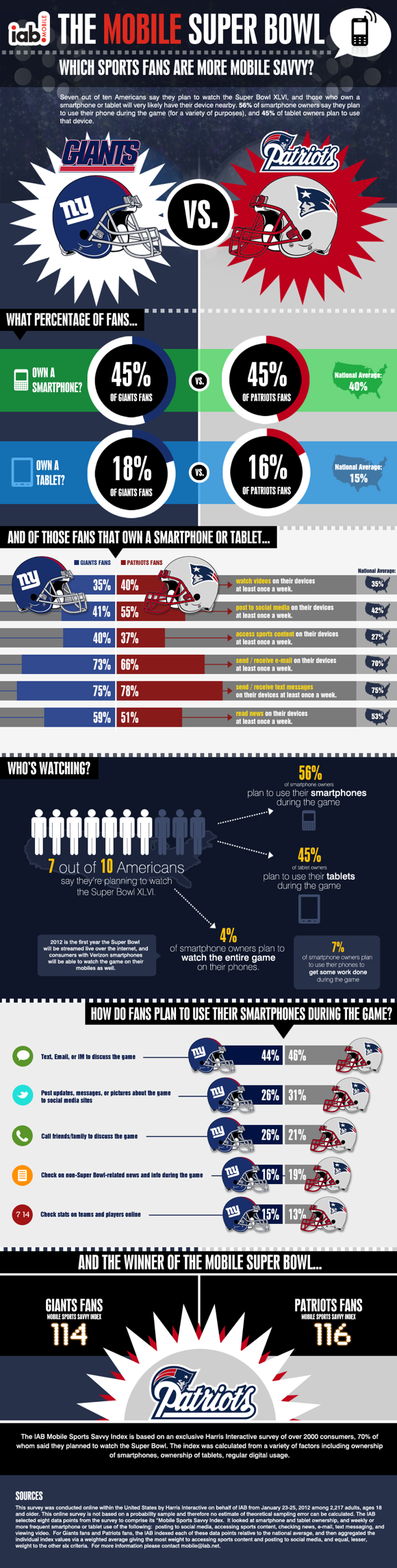 IAB制作了这张信息视图分析了超级碗巨人队和爱国者队两队的粉丝的移动使用行为差异。