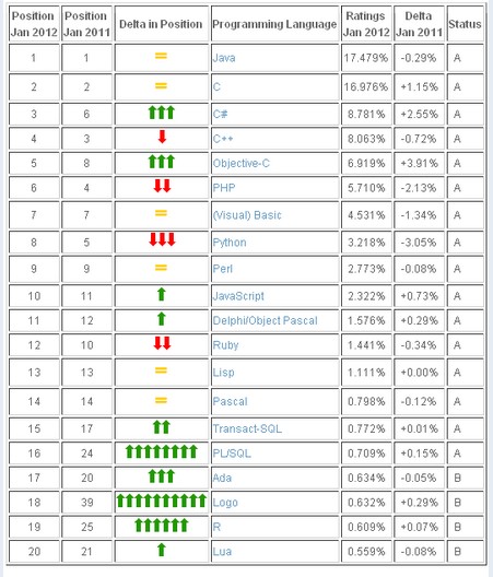 让我们看看TIOBE公布的1月编程语言排行榜的情况。前三位排名:Java、C、C#。正如去年12月预期的结果,C#取代了C++的位置。而 Objective-C在获得第二名的两年后,赢得了TIOBE 2011年度编程语言。Objective-C的目前市场份额增比2011年1月高出3.91%。这主要归功于iPhone和iPad的持续成功,这两种 设备上的程序主要都由Objective-C实现。