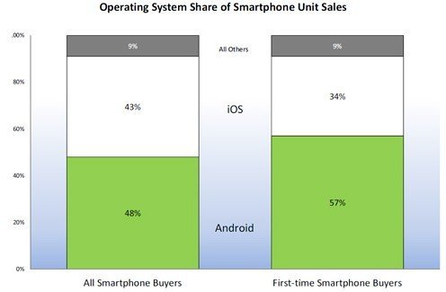 总计而言,Android智能手机和iPhone占了美国智能手机市场的90%。四季度Android在美份额为48%,不过,在首次购买智能手机的用户中,Android占了上风。四季度首次买智能手机的用户中,57%选择Android,只有34%选择iPhone。