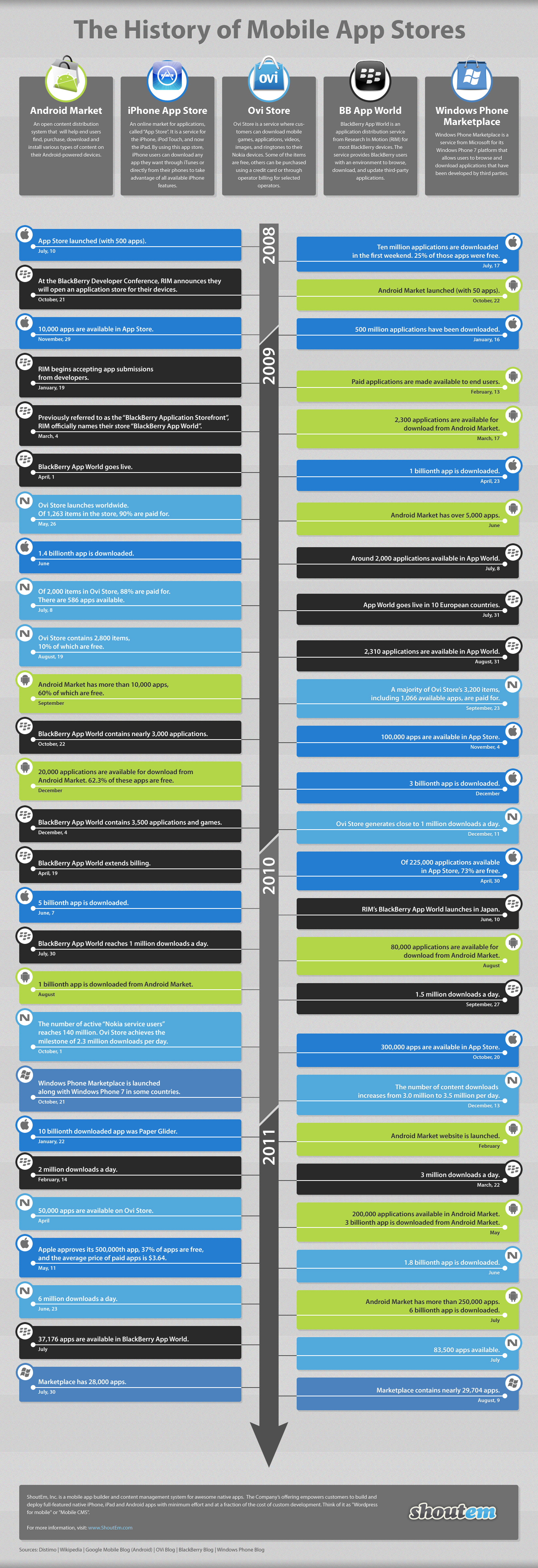 App stores目前是发布应用的第一大渠道,一些app商店表现比其他app商店好。下面这张信息视图展示了五大app商店的历史和演化- Android Market, iPhone App Store, Ovi Store, BB App World和Windows Phone Marketplace。