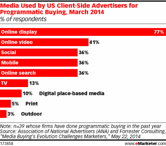 仅有不足1/4的美国客户端营销人员过去使用过程序化购买。那些在去年使用过程序化购买的公司,77%的被访者表示,他们使用的高端媒体购买是网络显示广告。然而,ANA和Forrester指出,购买已经超出了显示广告,而面向媒体,如网络视频、社交媒体和移动。