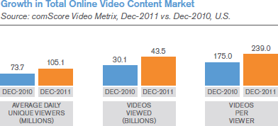 - 2011年在线视频用户增长迅速,显示出了美国用户消费视频方式的转变。2011年每天有1亿美国人收看在线视频,同比增长43%。
