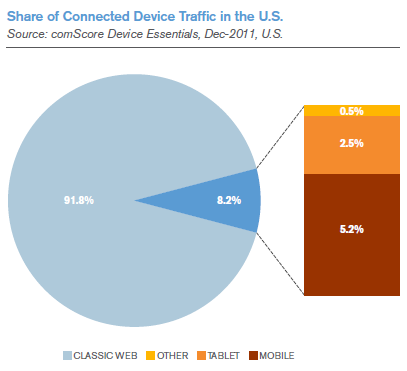 - 2011年,大部分手机用户通过手机消费内容,使得手机成为新的内容消费工具。8%的流量来自智能手机和平板电脑。