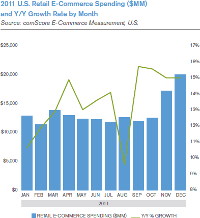- 尽管经济环境不确定性,2011年是电商增长的快速一年。整个美国零售和旅游相关的电子商务市场达到2560亿美元,同比上升12%