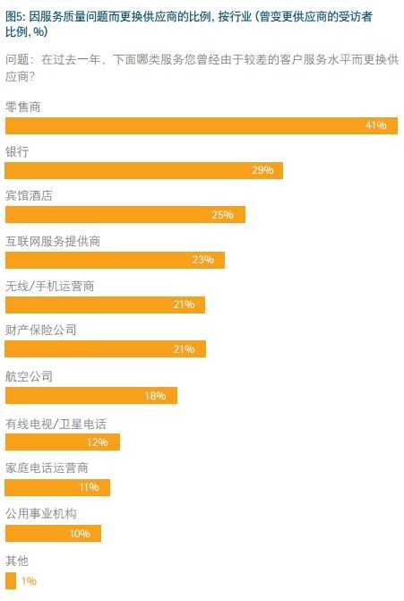 调研结果显示,导致中国消费者更换供应商的主要原因是服务质量问题。近年来,消费者对于服务质量的需求意识开始觉醒,对企业服务质量的期望大大提高,而且信息渠道的多样化也使消费者更容易货比三家。