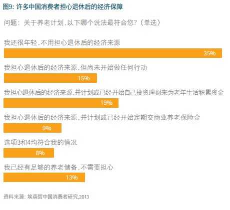 中国消费者通过保险产品进行养老的做法为金融机构提供了发展机遇。对金融机构而言,加强养老保险知识普及及宣传,设计适合中国的保险产品,并使用有效的营销渠道都是促进保险市场发展不可或缺的环节。
