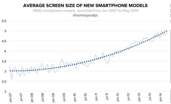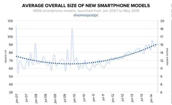 手机屏幕的平均尺寸从3寸上升到4寸用了5年的时间,而从4寸上升到现在的5寸只用了两年。