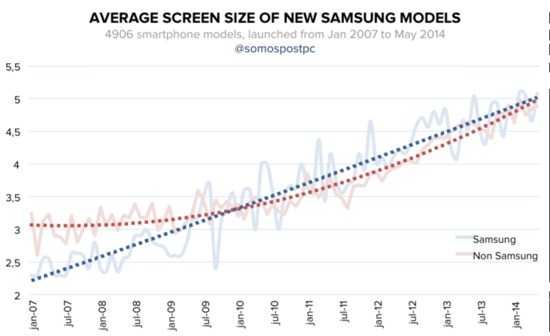 三星选对了方向了吗?还是说只是运气比较好?我们不得而知,但数据是很明显的:三星手机比市场上平均手机要大。