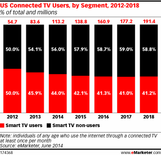 由于通过机顶盒、游戏机和蓝光设备收看电视、电影和其他视频内容的消费者数量增加,2014至2018年,联网电视用户中智能电视用户所占份额会有少许下降;非智能电视用户将有所上升。今年,非智能电视用户占联网电视用户56.0%。到2018年,会上涨到58.8%。