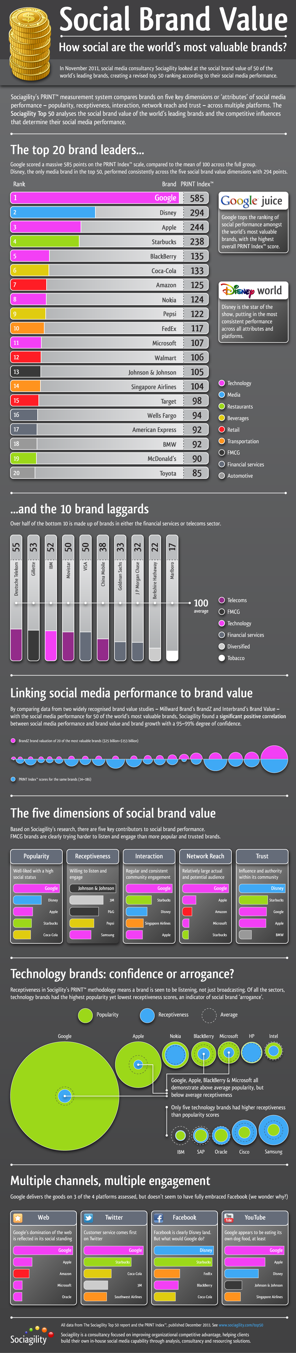 2011年11月, Sociagility发布了50大社交网络品牌报告,sociagility通过Popularity(流行度),Receptiveness(倾听度),Interaction(互动度),Network reach(网络到达),Trust(信任度)等这几个维度评估品牌的综合社交指数,从而得出排名。