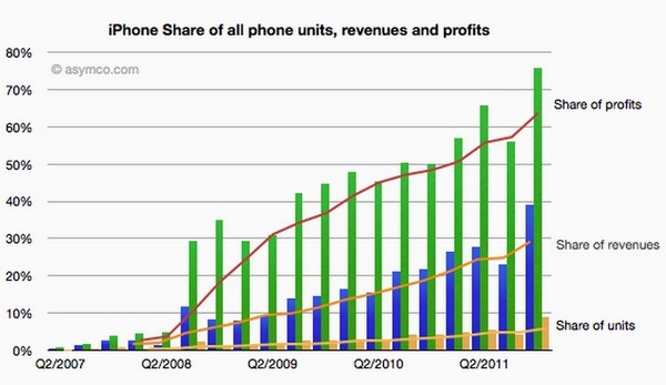 Asymco也关注了iPhone的发货量、营收和利润三个维度的增长。可以发现,iPhone利润份额的增长速度远超其营收的增长。这张图表是依据主要的8家移动厂商数据绘制的,因此与全球市场的实际比重有出入,不过仍然很好地反映了iPhone的增长势头。