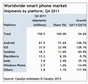 具体到2011年第四季度,Android手机的发货量占到了全部智能手机的51.6%,iOS占到23.4%,大大超出全年的平均水平,塞班和黑莓被挤掉的份额最多。