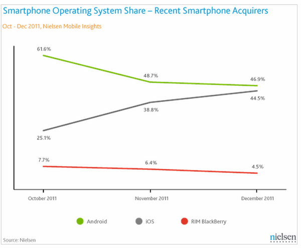 Nielsen统计了2011年第四季度移动OS在美国的市场分布情况。左边是截止2011年底全部智能手机用户的OS份额,右边是第四季度新增加的智能手机OS份额。可以看到Android占比重最大,iOS增长最迅速,而黑莓的市场在不断流失。