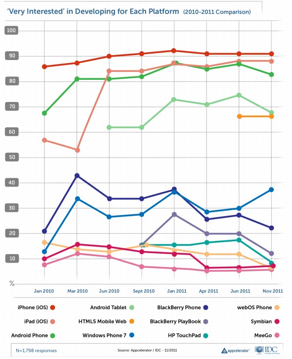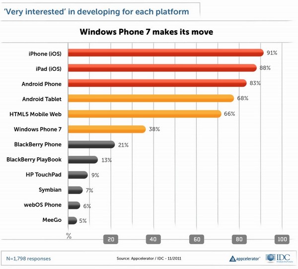 从市场占有率来看,2011年第四季度移动OS的竞争仍是iOS和Android之间的竞争。但是移动生态的重要一环——应用开发者对于移动OS的认识正发生新的变化。Appcelerator与IDC于在11月初调查了两千余名开发人员关于移动OS发展趋势的观点。报告显示,除了领跑的iOS和Android,HTML和WP7的热度上升,分别有66%和38%的开发者对这两个平台“非常感兴趣”。