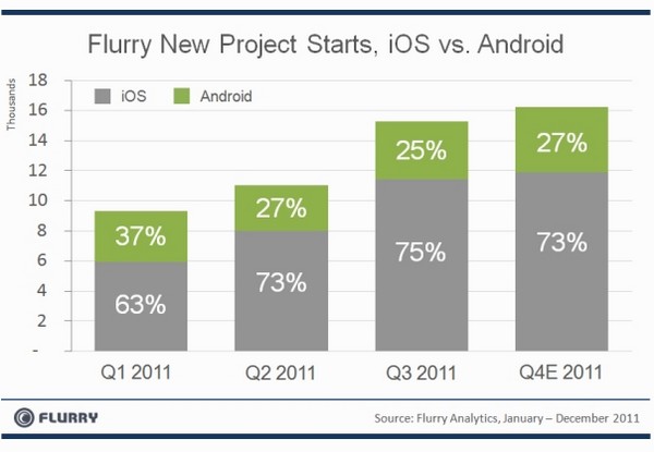Flurry通过追踪其Analytics SDK的使用情况来了解新建项目开发者的OS选择倾向,不过这种比较仅限于iOS与Android两大平台之间。可以发现,越来越多的人加入了移动应用开发的大军,第四季度的新建项目数量几乎比第一季度翻了一番。但是这主要依赖iOS项目的增多,第四季度有73%新建项目选择了iOS。