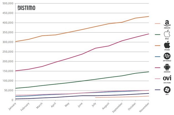 Distimo的年度报告盘点了2011年各大应用商店的发展情况。2011年十一月,各应用商店的应用数量总和超过了100万大关。应用数量最多的仍是App Store (iPhone),增长速度最快的是Android应用。