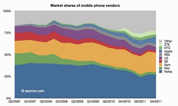 Asymco也给出了近年来每季度全球主要手机厂商市场占有率变化(包括智能机和非智能机),可以看到苹果的比重在不断增加,索爱和摩托罗拉则在不断缩水。