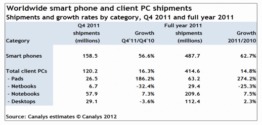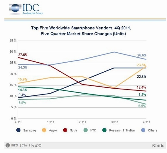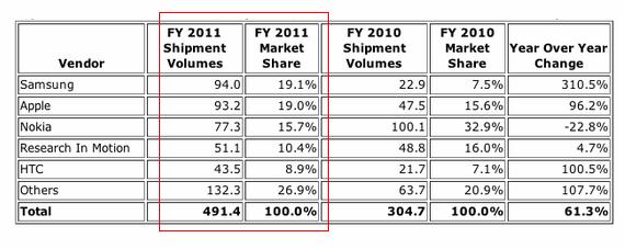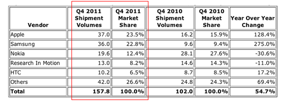 据IDC统计,2011年第四季度全球智能手机发货量为1.578亿台,比去年同期上涨54.7%。苹果超越三星,以3700万台iPhone的发货量居首位,市场占有率23.5%。